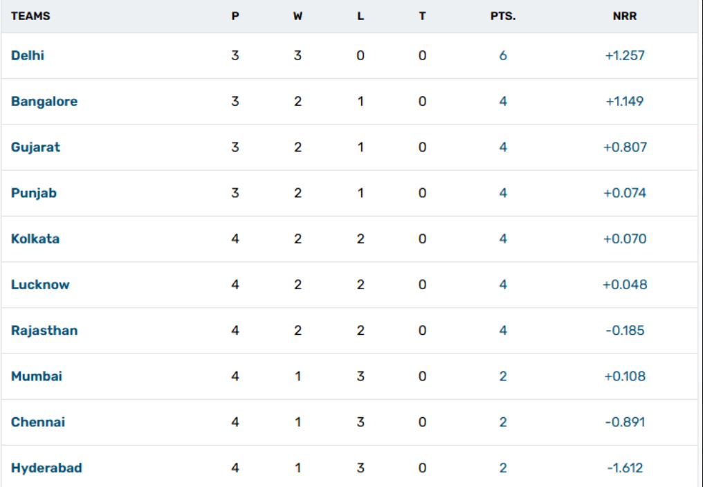 IPL 2025 Points table दिल्ली कैपिटल्स ने चेन्नई सुपरकिंग्स को मात देकर आईपीएल 2025 में जीत की हैट्रिक लगाई और प्वाइंट्स टेबल में शीर्ष स्थान हासिल किया। वहीं पंजाब किंग्स को अपने होमग्राउंड मुल्लांपुर में राजस्थान रॉयल्स के हाथों 50 रन की शिकस्त मिली जिससे उसे तगड़ा नुकसान हुआ। इन दोनों मैच के बाद प्वाइंट्स टेबल में बड़ा फेरबदल हुआ।