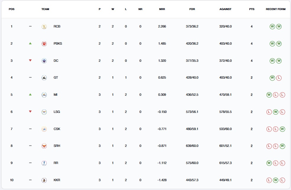 बता दें कि आईपीएल 2025 में रॉयल चैलेंजर्स बेंगलुरु की टीम प्वाइंट्स टेबल में नंबर-1 पर जमी हुई है। पंजाब ने दूसरा स्थान हासिल किया और बेहतर रन रेट के कारण दिल्ली कैपिटल्स को तीसरे स्थान पर खिसका दिया है। मौजूदा आईपीएल में केवल तीन टीमों ने अपने शुरूआती दोनों मैच जीते- आरसीबी, पीबीकेएस और डीसी।