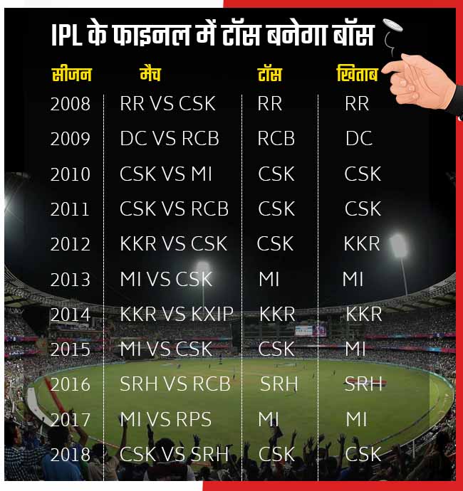 आइपीएल फाइनल को देखें, तो आपको समझ में आ जाएगा कि टॉस कितना महत्वपूर्ण है। अबतक खेले गए 11 फाइनल में 7बार ऐसा हुआ जब टॉस जीतने वाली टीम ने ट्राफी भी उठाई है। तीन सीजन, जिसमें चेन्नई विजेता बनी, टॉस भी उनके पक्ष में गिरा है। वहीं दोबार ऐसे हुआ जब टॉस और फाइनल दोनों ही मुंबई के पक्ष में गए हो। कोलकता और राजस्थान भी एक-एक बार टॉस जीतकर ट्रॉफी उठाई है। चेन्नई ने अबतक किसी भी फाइनल में टॉस गंवाकर मैच नहीं जीता है। ऐसे में टॉस चेन्नई के लिए बहुत महत्वपूर्ण हो जाता है।