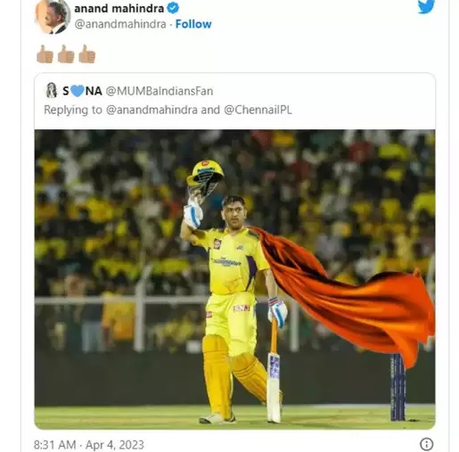 इस सीजन भारत के मशहूर बिजनसमैन आनंद महिंद्रा ने IPL मैच का एक क्लिप पोस्ट किया। इस क्लिप में महेंद्र सिंह धोनी ताबड़तोड़ बल्लेबाजी करते नजर आ रहे हैं।