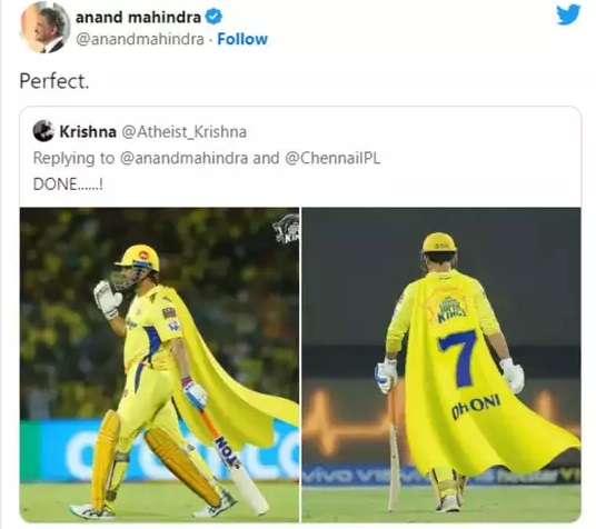 बिजनेसमैन ने कैप्शन में लिखा,"मुझे लगता है कि चेन्नई आईपीएल को अब एक Cape (गर्दन से बंधा कपड़ा) को एमएस धोनी की स्पेशल यूनिफॉर्म का हिस्सा बनाना चाहिए। हम बिना उसके एक सुपरहीरो की जाने की उम्मीद कैसे कर सकते हैं? क्या प्रपोज्ड (प्रस्तावित) Cape डिजाइनों के साथ कोई मीम्स बन सकती है?"