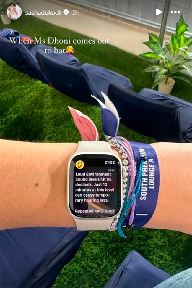 लखनऊ सुपरजायंट्स के क्विंटन डी कॉक की पत्नी साशा कॉक ने अपने इंस्टाग्राम अकाउंट पर एक स्टोरी शेयर की, जो वायरल हो गई है। साशा ने स्टोरी पर अपनी स्मार्ट वॉच का एक फोटो शेयर करते हुए कैप्शन लिखा, ''तब एमएस धोनी बल्लेबाजी करने आएं।'' साशा की वॉच में लिखा हुआ दिखा, ''जोरदार वातावरण। साउंड स्तर 95 डेसीबल को छू चुका है। इस स्तर पर सिर्फ 10 मिनट की आवाज अस्थायी बहरापन कर सकता है। यह लंबे समय तक चल दोहराया जा सकता है।''