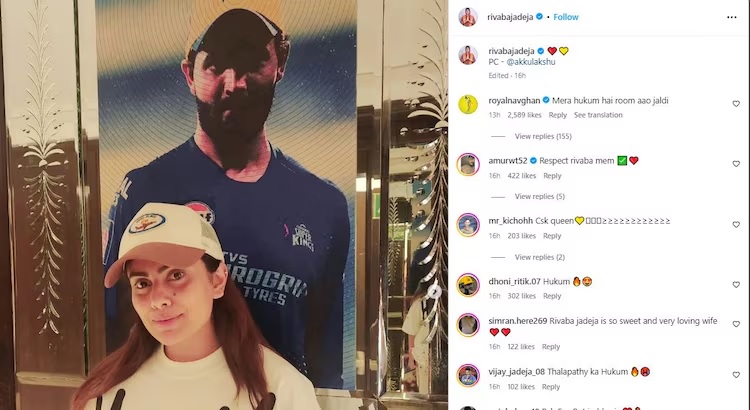 बता दें कि रिवाबा जडेजा ने अपने पति रवींद्र की फोटो के आगे खड़े होकर एक फोटो पोस्ट किया। यह फोटो चेन्नई सुपरकिंग्स के टीम होटल का है। तभी क्रिकेटर ने फोटो पर तुरंत प्रतिक्रिया दी और कमेंट में लिखा, ''मेरा हुक्म है कि रूम आओ जल्दी।'' सुपरकिंग्स के फैंस ने तुरंत इस डायलॉग को रजनीकांत की मशहूर तमिल ब्लॉकबस्टर फिल्म जेलर से जोड़ा।
