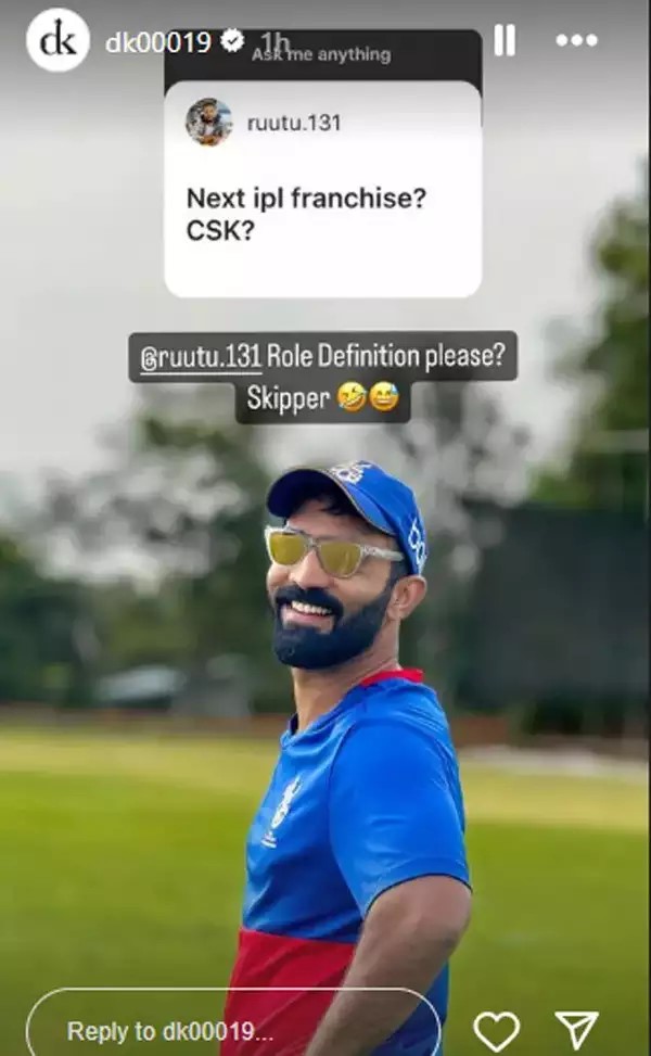दरअसल, इस महामुकाबले से पहले दिनेश कार्तिक ने सीएसके के कप्तान रुतुराज गायकवाड़ के संदेश वाली एक रोमांचक इंस्टाग्राम स्टोरी पोस्ट की। रुतुराज ने अनुभवी विकेटकीपर बल्लेबाज से अपनी अगली आईपीएल टीम के रूप में येलो आर्मी में शामिल होने के बारे में पूछा। कार्तिक की इंस्टाग्राम स्टोरी में रुतुराज ने कहा, "अगली आईपीएल फ्रेंचाइजी? सीएसके?" इस पर दिनेश कार्तिक ने जवाब दिया, "कृपया भूमिका की परिभाषा बताएं कप्तान?।
