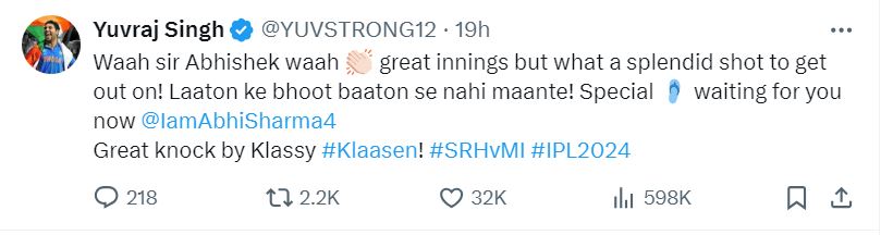 हालांकि, युवराज सिंह अभिषेक शर्मा की पारी से खुश दिखे। इस बावजूद जिस शॉट पर युवा बल्लेबाज आउट हुए थे, उससे युवराज नाराज दिखे। युवराज सिंह ने एक्स हैंडल पर अभिषेक शर्मा को पहले बधाई दी फिर खूब खरीखोटी सुनाई। युवराज ने लिखा, 'वाह सर अभिषेक वाह। कमाल की पारी लेकिन आउट होने के लिए क्या गजब शॉट लगाया। लातों के भूत बातों से नहीं मानते, अब खास चप्पल तुम्हारा इंतजार कर रही है।'