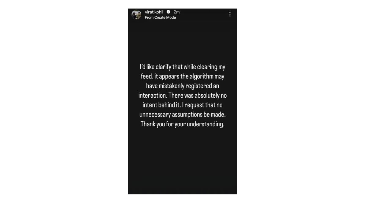 जैसे की ये मुद्दा सोशल मीडिया पर चर्चा में आया तो विराट कोहली परेशान हो गए और उन्होंने फिर अपनी सफाई पेश की। कोहली ने इंस्टाग्राम स्टोरी पोस्ट कर अपनी सफाई पेश की है। उन्होंने लिखा, "मैं इस बात को साफ कर देना चाहता हूं कि अपनी फीड को क्लीयर करते हुए, एलगोरिथम ने गलती से मेरे सामने वो पोस्ट ला दी। इसके पीछे किसी तरह की मंशा नहीं थी। मैं अपील करता हूं कि कोई गैरजरूरी बातें न फैलाई जाएं। मुझे समझने के लिए आपका शुक्रिया।"