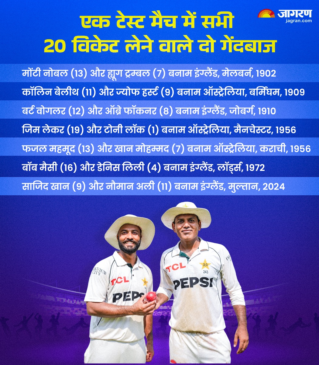 पाकिस्तानी स्पिनर साजिद खान और नौमान अली ने टीम की वापसी कराई। साजिद खान और नौमान अली ने मिलकर दोनों पारी में सभी 20 विकेट अपने नाम किए। इसके साथ ही उन्होंने 52 साल पुराना रिकॉर्ड भी तोड़ दिया है। साजिद और नौमान से पहले 1972 में बॉब मैसी (16) और डेनिस लिली (4) ने मिलकर इंग्लैंड के खिलाफ सभी 20 विकेट अपने नाम किए थे।