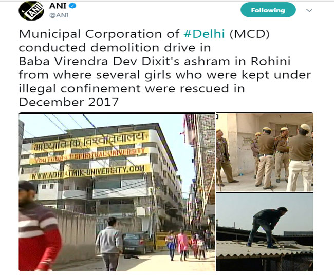 नई दिल्ली [जेएनएन]। आध्यात्मिक विश्वविद्यालय के नाम पर आश्रम में लड़कियों को बंधक बनाकर रखने के आरोपी बाबा वीरेंद्र देव दीक्षित का विजय विहार स्थित आश्रम तोड़ दिया गया है। एमसीडी की टीम मंगलवार को यह कार्रवाई की। एमसीडी के मुताबिक, वीरेंद्र देव ने नियमों को ताक पर रखकर यह आश्रम बनवाया था जिसे गिरा दिया गया है। किसी अप्रिय घटना से निपटने के लिए आश्रम के बाहर एहतियातन भारी संख्या में पुलिस बल तैनात किया गया है।