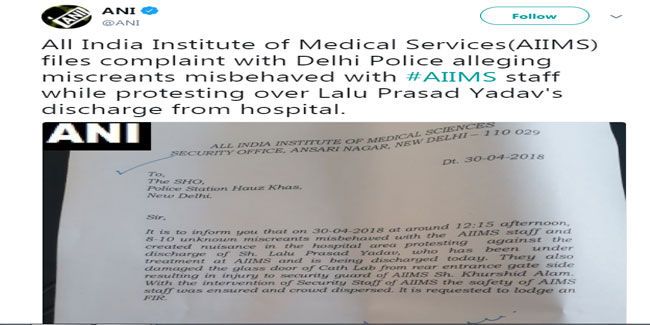 आरोप है कि लालू के समर्थकों ने अस्पताल के एक वार्ड में घुसकर खिड़की व शीशे भी तोड़ दिए। गुस्साए समर्थकों का कहना था कि राजनीतिक विद्वेष के तहत लालू को जबरन एम्स से निकाला गया है। इस मामले में एम्स प्रशासन ने दिल्ली पुलिस को शिकायत दी है।