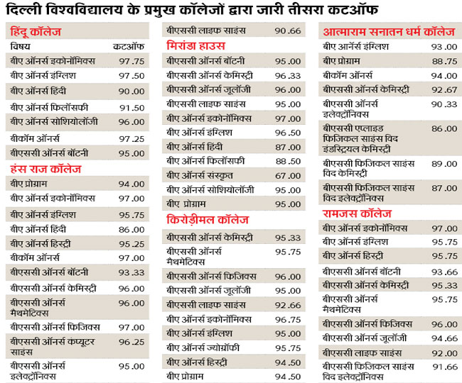 तीसरे कटऑफ में एक दर्जन से अधिक कॉलेजों ने सामान्य वर्ग के लिए बीकॉम ऑनर्स में दाखिले की खिड़की बंद कर दी है। इनमें आर्यभट्ट कॉलेज, भारती कॉलेज, कॉलेज ऑफ वोकेशनल स्टडीज, दौलतराम, इंद्रप्रस्थ, किरोड़ीमल कॉलेज, लेडी श्रीराम कॉलेज, मैत्रीय कॉलेज, मोतीलाल नेहरू (सांध्य), पीजीडीवी (सांध्य) व श्रीराम कॉलेज ऑफ कॉमर्स प्रमुख हैं।