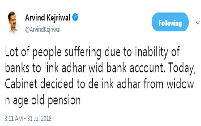दिल्ली के मुख्यमंत्री अरविंद केजरीवाल ने मंगलवार को ट्वीट कर कैबिनेट के फैसले की जानकारी लोगों को दी। दोपहर करीब सवा तीन बजे मुख्यमंत्री ने ट्वीट किया। ट्वीट में उन्होंने कहा कि बैंक खातों से आधार लिंक कराने के लिए बहुत से लोगों को समस्याओं का सामना करना पड़ रहा है। इसलिए कैबिनेट ने आज (मंगलवार) को फैसला लिया है कि वृद्धा अवस्था और विधवा पेंशन योजनाओं से आधार को लिंक करने की बाध्यता समाप्त कर दी जाए।