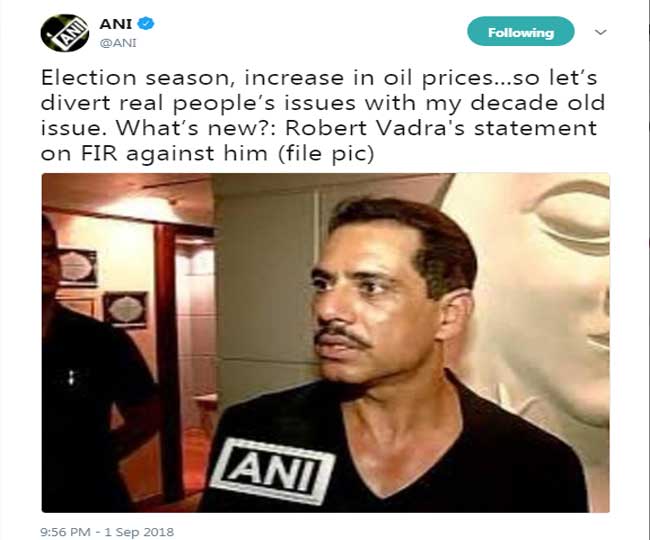 इस मामले पर रॉबर्ट वाड्रा ने कहा कि यह चुनाव का मौसम है, तेल की कीमत बढ़ रही है लेकिन लोगों के मुद्दों से ध्यान भटकाकर मेरे पुराने मामले पर दिया जा रहा है। इसमें कुछ नया नहीं है। कांग्रेस ने इस मामले को राजनीति से प्रेरित बताया है और कहा कि चुनाव नजदीक है इसलिए इस तरह के केस दर्ज कराए जा रहे हैं।