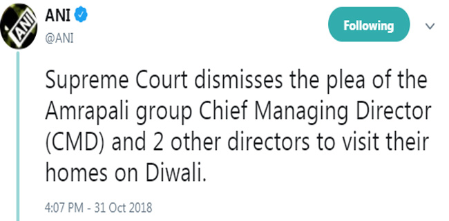 सुप्रीम कोर्ट सख्त, आम्रपाली ग्रुप के सीएमडी और डायरेक्टर्स दिवाली में नहीं जा सकेंगे घर