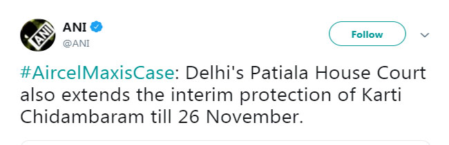 सीबीआई और प्रवर्तन निदेशालय द्वारा दायर एयरसेल-मैक्सिस मामले में अदालत ने 8 अक्टूबर को चिदंबरम और उनके बेटे कार्ति को राहत देते हुए गिरफ्तारी से एक नवंबर तक अंतरिम संरक्षण दिया था।