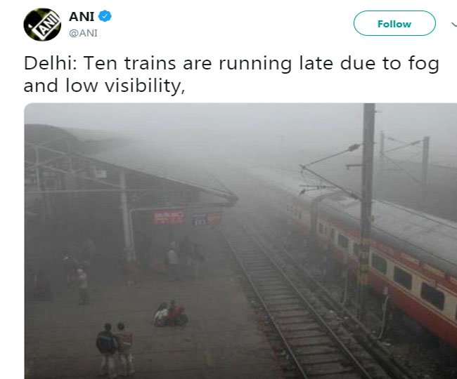 समाचार एजेंसी के मुताबिक, रेलवे ने आधिकारिक रूप से कोहरे के चलते 10 ट्रेनें रद की दी हैं, जबकि इससे अधिक ट्रेनों के समय में बदलाव किया है। ...और पढ़ें
