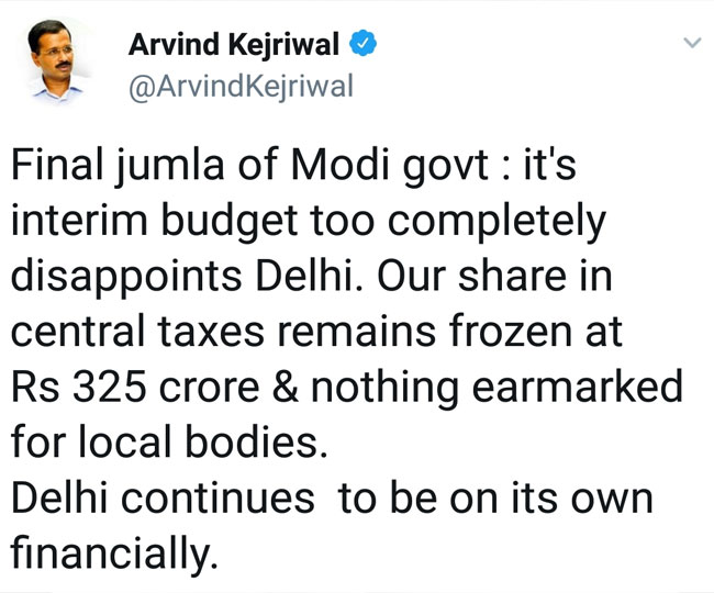 वहीं, पूरे बजट पर अपनी प्रतिक्रिया देते हुए सीएम अरविंद केजरीवाल ने 'फाइनल जुमला; बताया है। उन्होंने कहा कि यह मोदी का फाइनल जुमला है। इस अंतरिम बजट ने दिल्ली के लोगों को निराश किया है। केंद्रीय करों में हमारा हिस्सा 325 करोड़ पर ठहरा हुुआ है, वहीं स्थानीय निकायों को भी कुछ नहीं मिला है। यानी दिल्ली के लोगों को अपने बजट पर निर्भर रहना होगा।