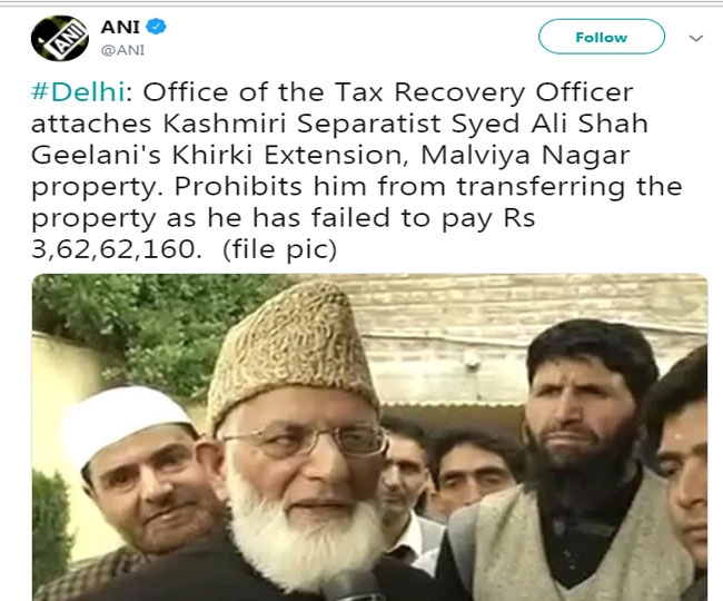 सैयद अली शाह गिलानी द्वारा 3.62 करोड़ रुपए का बकाया नहीं चुकाने पर आयकर विभाग ने ये कार्रवाई की है। गिलानी का ये घर राजधानी दिल्ली के पॉश इलाके मालवीय नगर में है। इस संबंध में 29 मार्च को गिलानी के खिलाफ कार्रवाई का आदेश जारी किया गया था। इस आवास में गिलानी के दामाद की भी हिस्सेदारी बताई जा रही है।