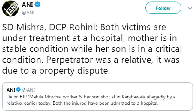 दिल्ली में BJP महिला मोर्चा की कार्यकर्ता व उनके बेटे को मारी गोली