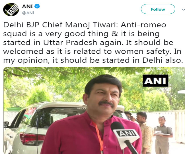 नई दिल्ली, एएनआइ। समूचे उत्तर प्रदेश में आगामी एक जुलाई (सोमवार) से शुरू होने जा रहे पुलिस ने एंटी रोमियो स्कवॉड (Anti-romeo squad) को लेकर दिल्ली भाजपा अध्यक्ष मनोज तिवारी (Delhi BJP Chief Manoj Tiwari) ने प्रसन्नता जताई है। उन्होंने इस पर अपनी प्रतिक्रिया देते हुए समाचार एजेंसी एएनआइ से कहा- एंटी रोमियो स्क्वॉड का दोबारा से यूपी में शुरू होना बहुत अच्छी बात है। यह महिलाओं की सुरक्षा से जुड़ा हुआ मसला है, इसलिए मैं इसका स्वागत करता हूं।' साथ ही उन्होंने यह बात भी जोड़ी- 'मेरी राय में एंटी रोमियो स्क्वॉड दिल्ली में भी शुरू होना चाहिए।'