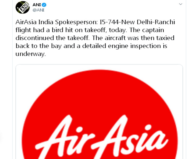 नई दिल्ली, एएनआइ। दिल्ली से झारखंड की राजधानी रांची जा रहे एयर एशिया की फ्लाइट को उस वक्त रोकना पड़ा जब उसके टेकऑफ के वक्त ही एक पक्षी टकरा गया। इसके बाद सुरक्षा के नजरिये से कैप्टन ने टेकऑफ को रोक दिया।