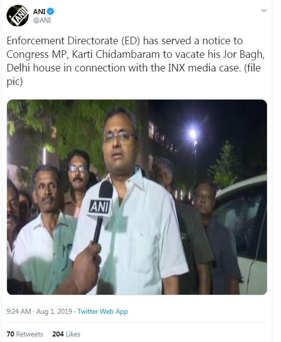 कार्ति चिदंबरम को ED का नोटिस, दिल्ली के जोर बाग आवास को खाली करने का निर्देश
