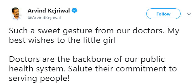 डॉक्टरों के इस इलाज से दिल्ली के मुख्यमंत्री अरविंद केजरीवाल भी प्रभावित हैं। उन्होंने शुक्रवार को ट्वीट कर 11 महीने की एक मासूम बच्ची जिकरा को शुभकामनाएं दी हैं। ट्विटर पर उन्होंने लिखा, छोटी बच्ची के इलाज के लिए उनकी तरफ से शुभकामनाएं। डॉक्टर हमारी सार्वजनिक स्वास्थ्य प्रणाली की रीढ़ हैं। उनकी सेवा करने की प्रतिबद्धता को हम सलाम करते हैं।