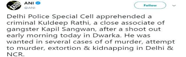 दिल्ली पुलिस को इत्तला मिली थी कुलदीप किसी बड़ी वारदात को अंजाम देने के लिए जा रहा है। स्पेशल सेल ने ट्रैप लगाया और जब बदमाश को रोकने की कोशिश की तो बदमाश ने दूसरी तरफ से फायरिंग कर दी। जवाब में स्पेशल सेल की टीम को भी गोली चलानी पड़ी और इस शूटआउट में कुलदीप के पैर में गोली लगी है । कुलदीप को घायल हालत में अस्पताल में भर्ती कराया गया है पुलिस ने कुलदीप को गिरफ्तार कर लिया है और मामले की जांच की जा रही है।