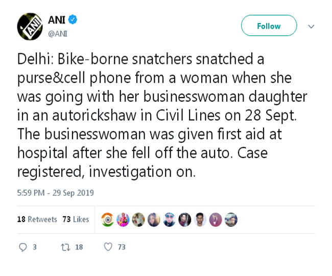 नई दिल्‍ली, एएनआइ। दिल्‍ली में बाइक सवार बदमाशों का खौफ कम नहीं हो रहा है। इस बार बाइक सवार स्नैचर ने दिल्‍ली के बिजनेसमैन की बेटी से उसका पर्स और मोबाइल लूट लिया है। यह घटना 28 सितंबर की है। इस मामले में पुलिस ने केस दर्ज कर मामले की जांच शुरू कर दी है।