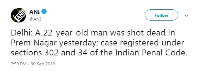 वहीं एक अन्य मामले में दिल्ली के प्रेम नगर इलाके में सोमवार को एक युवक की गोली मारकर हत्या कर दी गई। 22 वर्षीय युवक की हत्या के मामले में पुलिस ने आइपीसी की धारा 302 के तहत मामला दर्ज कर लिया है।