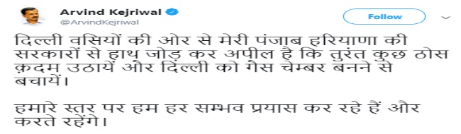 Delhi pollution: केजरीवाल का ट्वीट- दिल्ली को गैस चैंबर होने से बचाएं पंजाब-हरियाणा सरकार