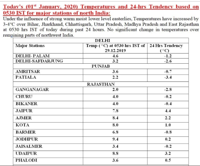 वहीं, मौसम विज्ञान विभाग के अनुसार, अगले दो दिनों तक अधिकतम व न्यूनतम तापमान में बढ़ोतरी होने के आसार हैं। साथ ही दो और तीन जनवरी के दिन हल्की बारिश होने की संभावना है। इसकी वजह से 4 और 5 जनवरी की सुबह घना कोहरा लौट सकता है।