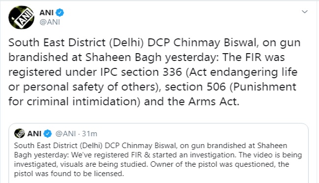 नई दिल्ली, एएनआइ/जेएनएन। साउथ ईस्ट दिल्ली के डीसीपी चिन्मय बिस्वाल ने बुधवार को बताया कि शाहीन बाग में पिस्तौल लहराने वाले के खिलाफ आईपीसी की धारा 336 (दूसरों की जान या निजी सुरक्षा को खतरे में डालने), धारा 506 (आपराधिक धमकी के लिए सजा) और आर्म्स एक्ट के तहत मामला दर्ज किया गया है। आरोपित से पूछताछ की गई तो पिस्टल का लाइसेंस होना पाया गया। फिलहाल मामले की जांच की जा रही है।