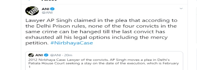 गौरतलब है कि बृहस्पतिवार सुबह चारों दोषियों (अक्षय सिंह ठाकुर, मुकेश सिंह, विनय कुमार शर्मा और पवन कुमार गुप्ता) की फांसी पर रोक के लिए वकील एपी सिंह ने पटियाला हाउस कोर्ट में याचिका दायर की।