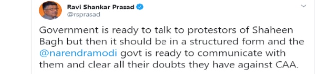 नई दिल्ली, एजेंसी। नागरिकता संशोधन कानून (Citizenship Amendment Act) और राष्ट्रीय नागरिकता रजिस्टर (National Register of Citizens) के विरोध में शाहीन बाग में 15 दिसंबर से चल रहे प्रदर्शन के खात्मे की उम्मीद बंधती दिखाई दे रही है। केंद्रीय कानून मंत्री रविशंकर ने कहा है कि केंद्र में सत्तासीन नरेंद्र मोदी सरकार तय रूपरेखा के दायरे में शाहीन बाग के प्रदर्शनकारियों से बातचीत के लिए तैयार है।