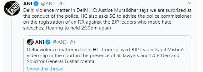 नागरिकता संशोधन कानून (सीएए) को लेकर उत्तर-पूर्वी दिल्ली में हुई हिंसक घटनाओं को लेकर दिल्ली हाई कोर्ट पुलिस को फटकार लगाई है। कोर्ट ने पुलिस का पक्ष रखने वाले सॉलिसिटर जनरल से पूछा कि क्या आपने कपिल मिश्रा के भाषण का वीडियो देखा। इस पर उन्होंने मना कर दिया और कहा वे टीवी न्यूज चैनल नहीं देखते। इसके बाद कोर्ट ने एक बार फिर सॉलिसिटर जनरल से पूछा क्या पुलिस अधिकारी वीडियो देखे हैं तो बताया कि दो वीडियो देखें है लेकिन एक वीडियो नहीं देखा है। जिस वीडियो को नहीं देखने की बात पुलिस ने कही वह कपिल मिश्रा का था।