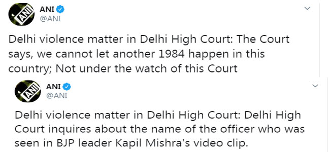 नई दिल्ली, एएनआइ/ प्रेट्र। दिल्ली हिंसा पर सुनवाई करते हुए हाई कोर्ट ने बुधवार को तल्ख टिप्पणी की। मामले की सुनवाई के दौरान कोर्ट ने कहा कि देश में एक बार फिर 1984 जैसे हालात नहीं होने देंगे। कोर्ट इसे नहीं देखेगी। हाई कोर्ट ने कपिल मिश्रा के साथ वीडियो क्लिप में दिख रहे पुलिस अधिकारी का नाम भी पूछा है।
