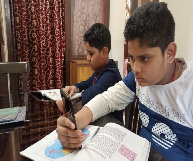 लॉकडाउन के बाद घर पर ही मोबाइल पर होमवर्क लेकर समय बिता रहे बच्चे