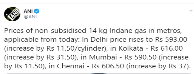 वहीं, 12 फरवरी 2020 को इंडेन गैस ने बिना सब्सिडी वाले रसोई गैस सिलेंडर के दामों में करीब 150 रुपये बढ़ोतरी की थी। इंडियन ऑयल ने दिल्ली में 14 किलो इंडेन गैस सिलेंडर की कीमत 144.50 रुपये बढ़ा दिया था। यह बढ़ोतरी पिछले 5 साल के दौरान सबसे ज्यादा दाम बढ़े थे।