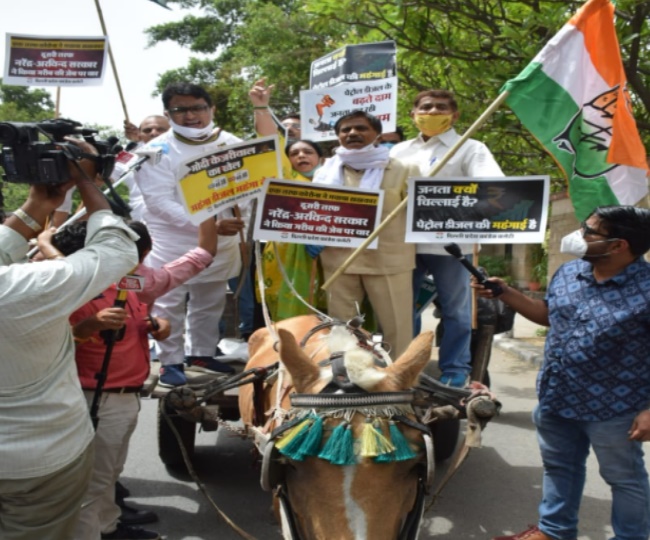 सिविल लाइन्स में घोड़ा गाड़ी पर सवार होकर अनिल चौधरी ने पार्टी के अन्य नेताओं और कार्यकर्ताओं के साथ केंद्र और राज्य सरकार के खिलाफ प्रदर्शन किया।
