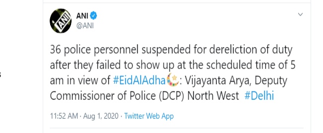 नई दिल्ली, एएनआइ। उत्तर पश्चिमी दिल्ली इलाके में ड्यूटी में लापरवाही बरतने के आरोप में 36 पुलिसकर्मियों को निलंबित कर दिया गया है। समाचार एजेंसी एएनआइ के मुताबिक, ईद त्योहार पर शनिवार सुबह 5 बजे तय की गई ड्यूटी पर देरी से पहुंचने के चलते सभी 36 पुलिसवालों को निलंबित किया गया है। बताया जा रहा है कि सभी की ड्यूटी सुबह 5 बजे तय की गई थी, लेकिन सभी पुलिसकर्मी देरी से पहुंचे। निलंबन की यह कार्रवाई उत्तर पश्चिमी दिल्ली के डीसीपी विजयंता आर्या (Vijayanta Arya, Deputy Commissioner of Police North West Delhi) ने की है। बताया जा रहा है कि निलंबन के पीछे अन्य पुलिसकर्मियों को यह संदेश देना है कि लापरवाही बतरने वाले किसी भी पुलिसकर्मी को बख्शा नहीं जाएगा।