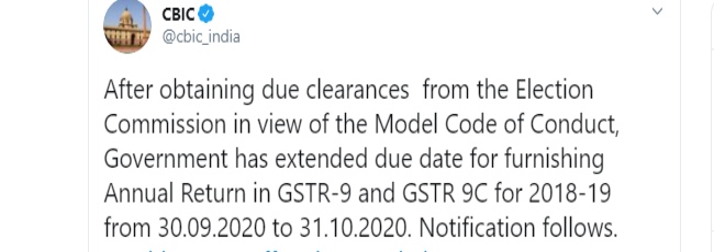 'जीएसटीआर-9 और जीएसटीआर 9सी के तहत वार्षिक रिटर्न दाखिल करने की नियत तारीख को 30 सितंबर 2020 से बढ़ाकर 31 अक्टूबर 2020 तक कर दिया है। बता दें कि इससे पहले सरकार ने मई में 2018-19 के लिए वार्षिक जीएसटी रिटर्न दाखिल करने की अंतिम तिथि को सितंबर 2020 तक तीन महीने के लिए बढ़ाया था।'