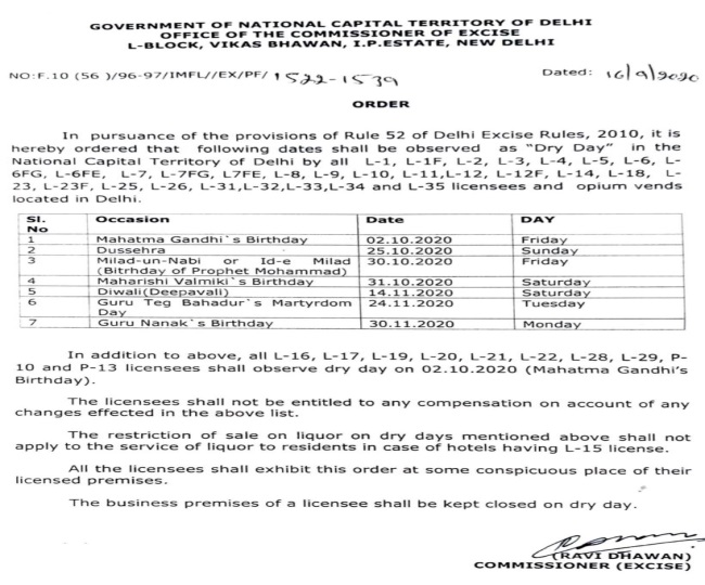 इससे पहले पिछले महीने 30 अक्टूबर को को मिलाद-उल-नबी के चलते शराब की दुकान पहले ही बंद थीं। फिर इसके अगले दिन बाल्मिकी जयंती पर भी शराब की दुकानें बंद रही थीं। इसके बाद 25 दिसंबर को दिल्ली में ड्राइ डे पर शराब की दुकानें बंद रहेंगी। इस दिन क्रिसमस है।