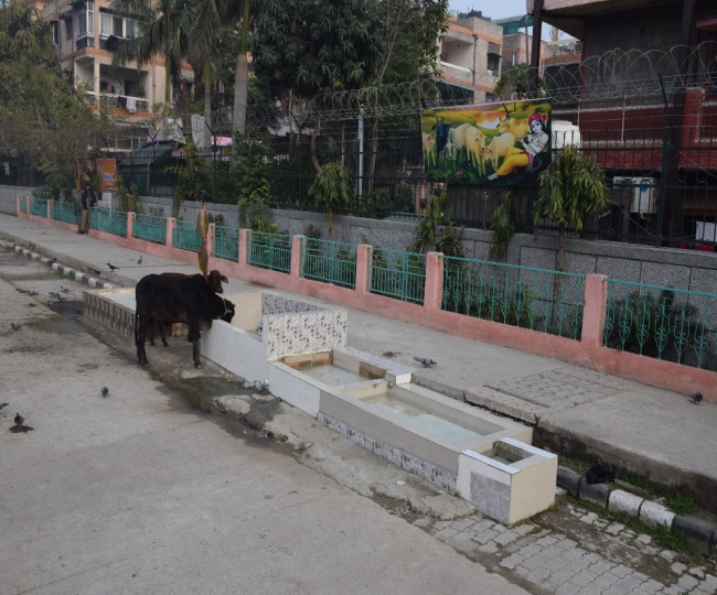 चारे के लिए फुटपाथ पर बनाई बनाई हौदहिमांशु ने बताया कि घर के सामने सर्विस रोड पर पशुओं के चारे व पानी के लिए दो अलग-अलग हौद बनायी गई है। एक हौद में पशुओं के लिए चारा बनाया जाता है और दूसरे हौद में पानी की व्यवस्था है। जिस पशु को भूख लगती है व चारा खाता है और जिस पशु को प्यास लगती है वह आराम से पानी पी लेता है। पानी के लिए घर की छत पर एक अलग से पांच सौ लीटर की टंकी लगाई गई है, ताकि पशुओं को हर समय पर्याप्त पानी मिल सके। साथ ही कहा कि सुबह से लेकर शाम तक क्षेत्र के सभी असहाय पशु यहां आकर चारा खाते है। इसी क्रम में सुबह से लेकर शाम तक क्षेत्र के अन्य लोग भी अपने घरों में बचा हुआ खाना भी उन पशुओं के लिए डाल जाते है।