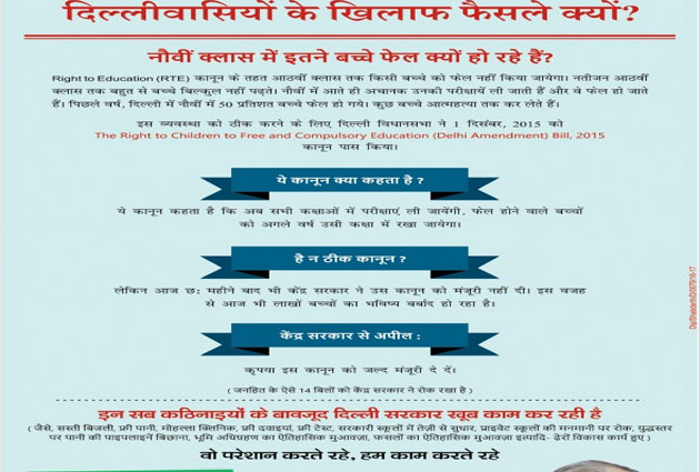 दिलली सरकार ने विज्ञापन जारी कर आरोप लगाया है कि इस कानून को जल्द मंजूरी दी जाए। साथ ही यह भी कहा गया हैै कि जनहित के ऐसे 14 बिलों को रोक रखा है।