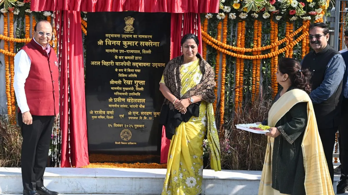 रिंग रोड स्थित अटल बिहारी वाजपेयी सद्भावना उद्यान का उद्धाटन करते एलजी वीके सक्सेना व मुख्यमंत्री रेखा गुप्ता। हरीश कुमार
