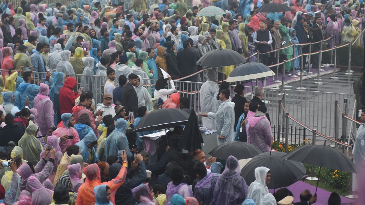 सुरक्षा जांच कई चरणों में की जा रही थी। समारोह के दौरान विजय चौक इलाके में दोपहर दो बजे से रात साढ़े नौ बजे तक यातायात प्रतिबंधित रहा। इसके लिए यातायात पुलिस ने एक दिन पहले ही एडवाइजरी जारी कर लोगों को परेशानी से बचने की सलाह दी थी।
