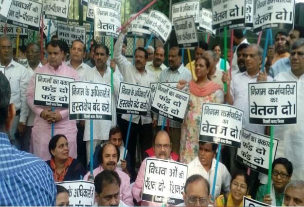 प्रदर्शन के दौरान आज भाजपा नेताओं ने आरोप लगाया है कि दिल्ली सरकार दिल्ली नगर निगम के मुद्दे पर राजनीति कर रही है।