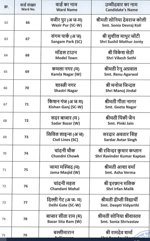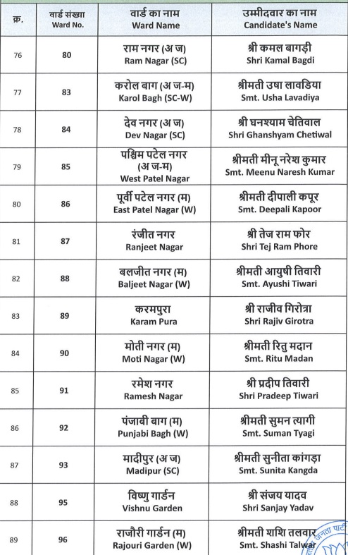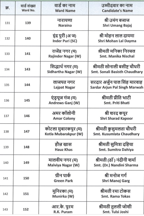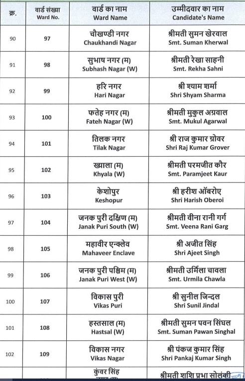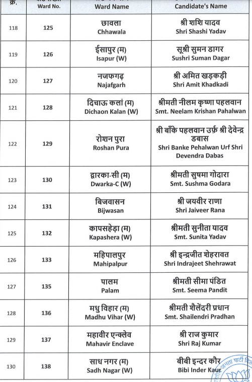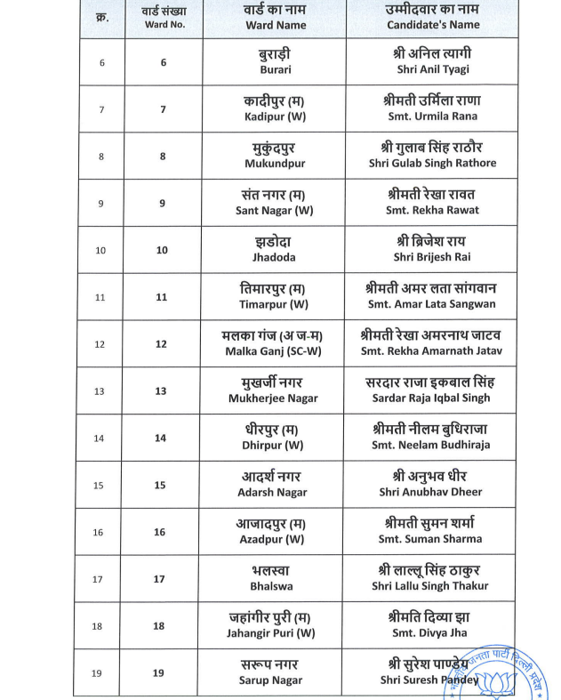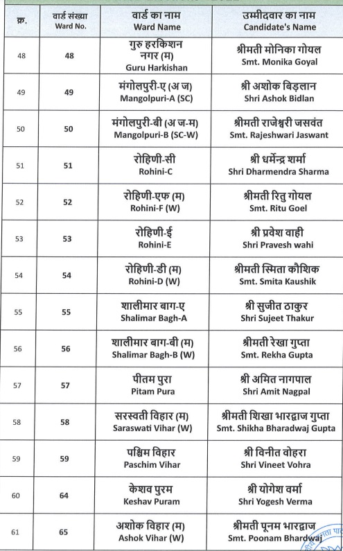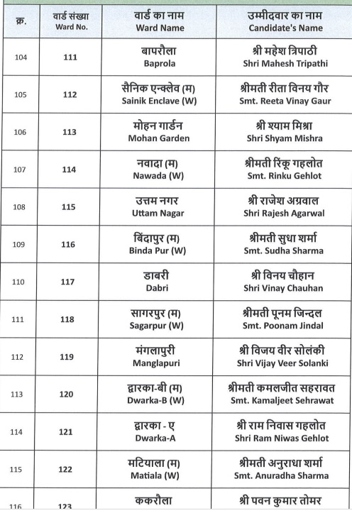 नई दिल्ली, राज्य ब्यूरो। दिल्ली नगर निगम चुनाव के लिए सभी दलों की तैयारी तेज हैं। आम आदमी पार्टी के बाद अब भाजपा ने अपनी सूची जारी कर दी है। भाजपा प्रदेश अध्यक्ष आदेश गुप्ता की अध्यक्षता में बैठक हुई जिसमें भाजपा प्रत्याशियों की सूची जारी की गई।