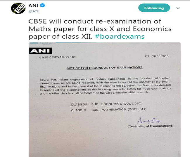 बुधवार को सीबीएसइ ने इन दो पेपरों में फिर से परीक्षा लेने की पुष्टि कर दी है। आपको बता दें कि 12वीं अर्थशास्त्र की परीक्षा 27 मार्च और 10वीं गणित की परीक्षा 28 मार्च को हुई थी। सीबीएसइ ने बताया है कि परीक्षा की तारीख की घोषणा एक सप्ताह के भीतर वेबसाइट पर कर दी जाएगी।