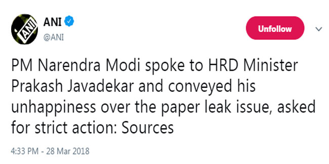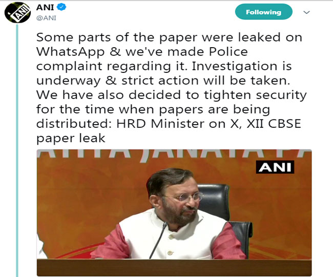 इस बीच केंद्रीय मानव संसाधन मंत्री प्रकाश जावड़ेकर ने सीबीएसइ पेपर लीक पर दुख जताते हुए कहा है कि जांच के बाद दोषियों के खिलाफ सख्त से सख्त कार्रवाई की जाएगी। उन्होंने छात्रों और अभिभावकों को भरोसा दिलाया कि आगे से सारी परीक्षाएं लीक प्रूफ होंगी। जावड़ेकर ने कहा कि पेपर लीक केस की पुलिस जांच अहम मोड़ पर है, लिहाजा वह जांच के विषय में ज्यादा कुछ नहीं बोलेंगे। उन्होंने कहा कि कुछ हिस्सों में पेपर वॉट्सऐप पर लीक हुए थे और इस संबंध में हमने पुलिस में शिकायत दर्ज कराई है।